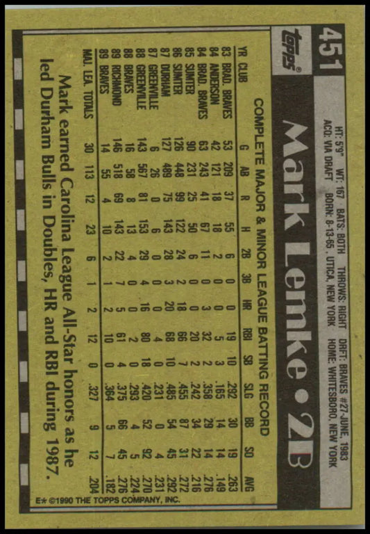 1990 Topps #451 Mark Lemke NM-MT Atlanta Braves Baseball Card
