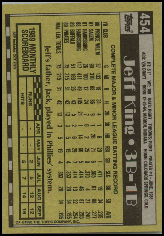 1990 Topps #454 Jeff King NM-MT Pittsburgh Pirates Baseball Card