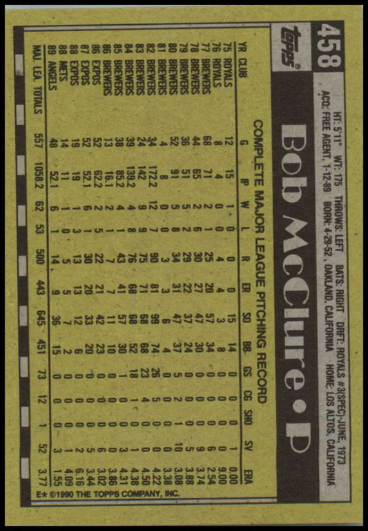 1990 Topps #458 Bob McClure NM-MT California Angels Baseball Card