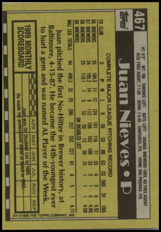 1990 Topps #467 Juan Nieves NM-MT Milwaukee Brewers Baseball Card