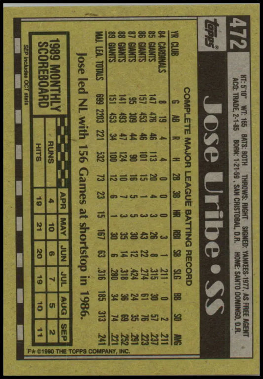 1990 Topps #472 Jose Uribe NM-MT San Francisco Giants Baseball Card