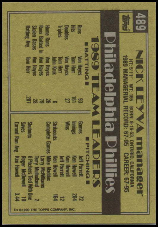 1990 Topps #489 Nick Leyva MG NM-MT Philadelphia Phillies Baseball CardRegular price $0.79 USDRegular priceUnit price / per-