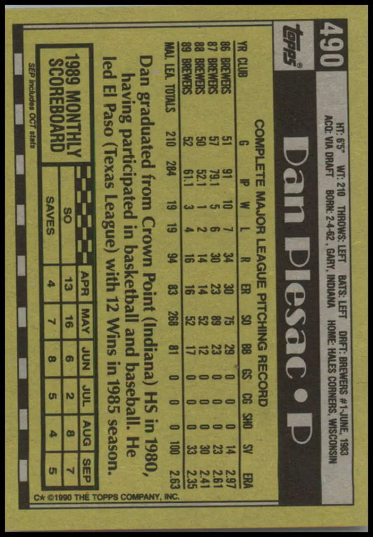 1990 Topps #490 Dan Plesac NM-MT Milwaukee Brewers Baseball CardRegular price $0.79 USDRegular priceUnit price / per-