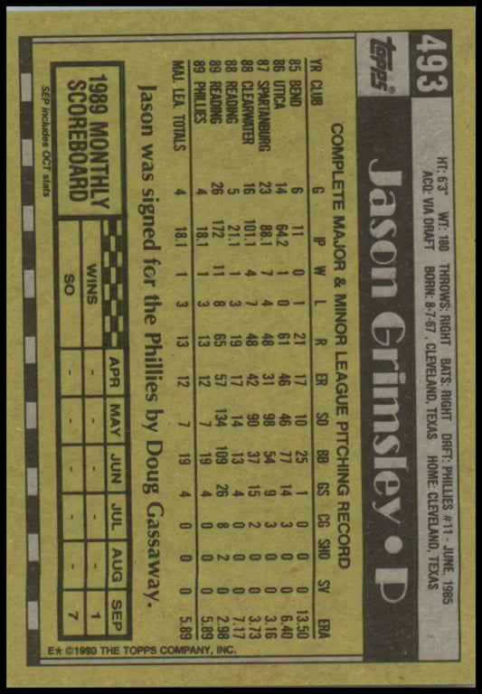 1990 Topps #493 Jason Grimsley NM-MT RC Rookie Philadelphia Phillies Baseball CardRegular price $0.79 USDRegular priceUnit price / per-