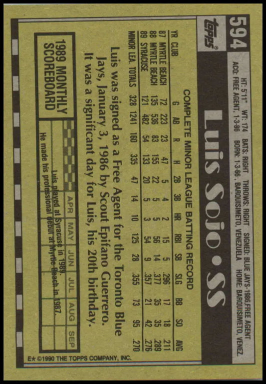 1990 Topps #594 Luis Sojo NM-MT RC Rookie Toronto Blue Jays Baseball CardRegular price $0.79 USDRegular priceUnit price / per-