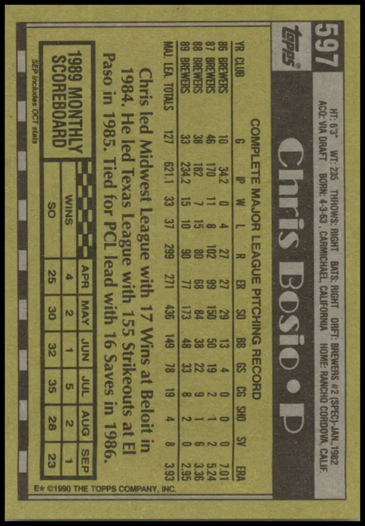 1990 Topps #597 Chris Bosio NM-MT Milwaukee Brewers Baseball CardRegular price $0.79 USDRegular priceUnit price / per-