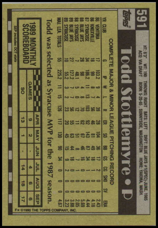 1990 Topps #591 Todd Stottlemyre NM-MT Toronto Blue Jays Baseball CardRegular price $0.79 USDRegular priceUnit price / per-