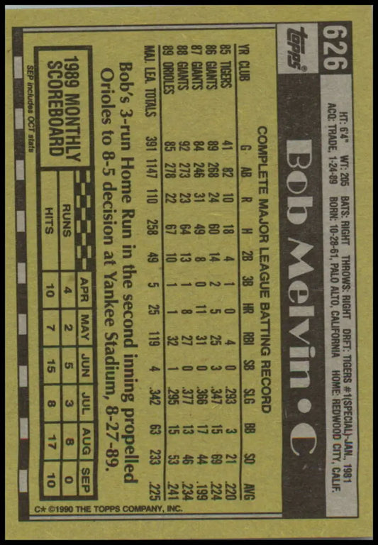 1990 Topps #626 Bob Melvin NM-MT Baltimore Orioles Baseball Card