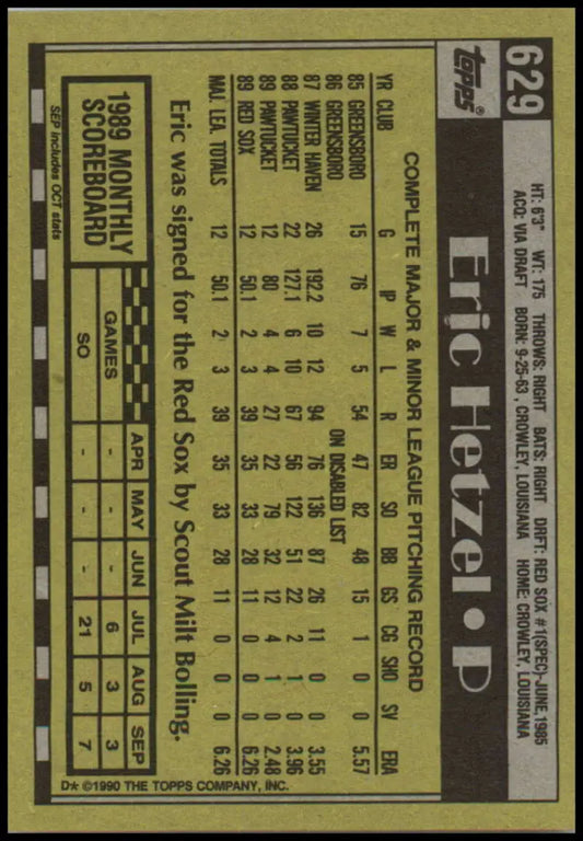 1990 Topps #629 Eric Hetzel NM-MT Boston Red Sox Baseball Card
