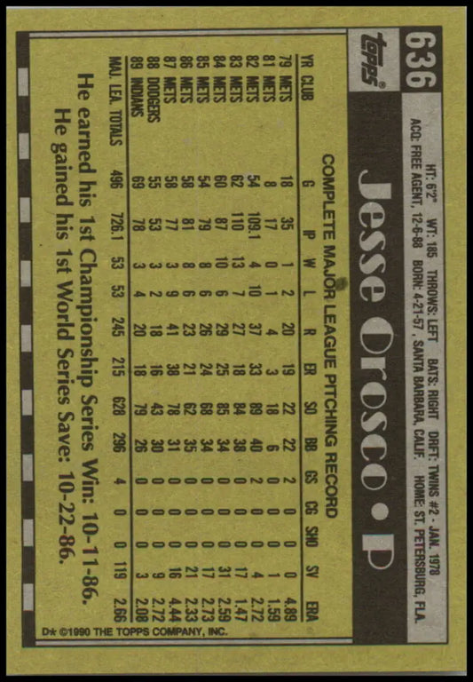 1990 Topps #636 Jesse Orosco NM-MT Cleveland Indians Baseball Card