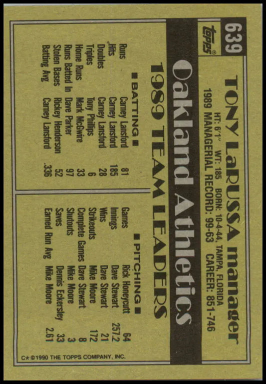 1990 Topps #639 Tony LaRussa MG NM-MT Oakland Athletics Baseball Card