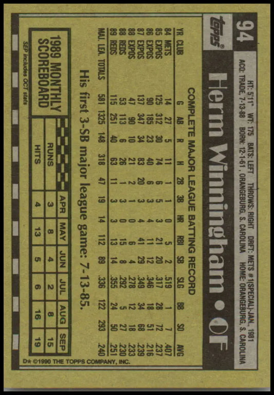 1990 Topps #94 Herm Winningham NM-MT Cincinnati Reds Baseball Card