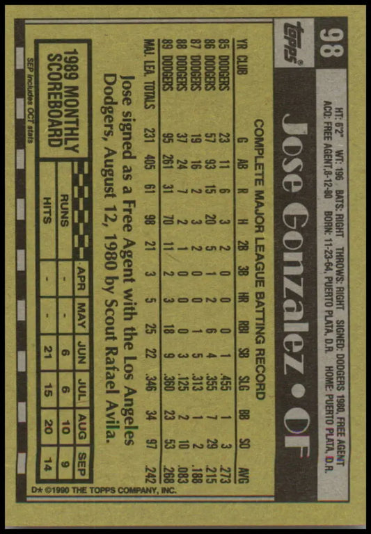 1990 Topps #98 Jose Gonzalez Los Angeles Dodgers Baseball Cards EX/N ID:55019
