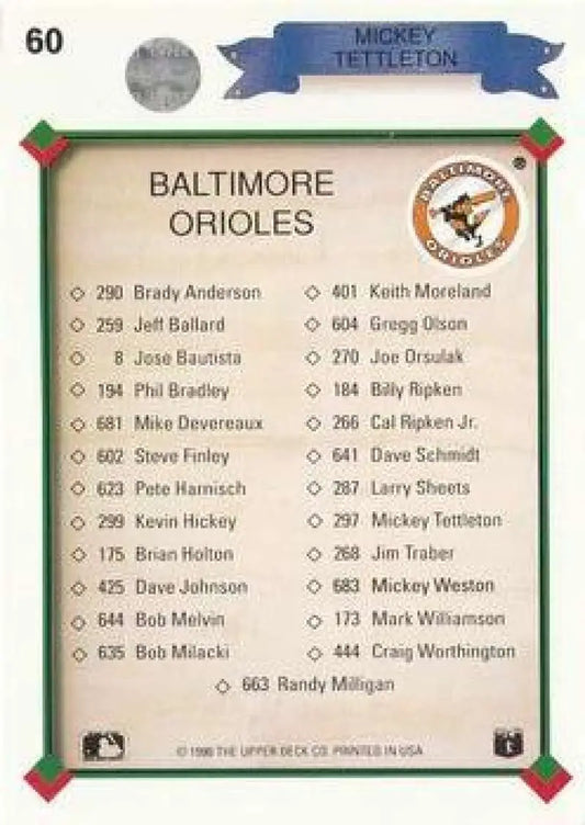 1990 Upper Deck #60b Mickey Tettleton Baltimore Orioles Baseball Car ID:60830