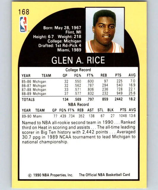 1990-91 Hoops #168 Glen Rice NM-MT RC Rookie Miami Heat Basketball Card