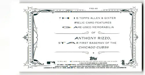 2014 Allen and Ginter Full Size Relics #FRB-AR Anthony Rizzo NM-MT MEM ID:78708