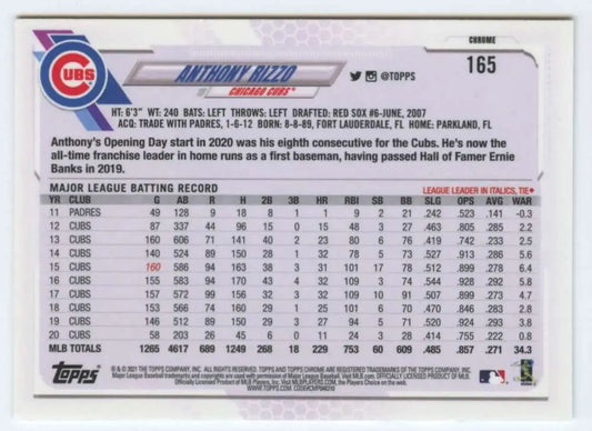 2021 Topps Chrome #165 Anthony Rizzo NM-MT Chicago Cubs Baseball Card