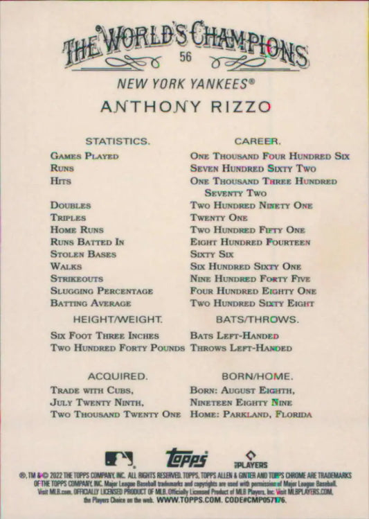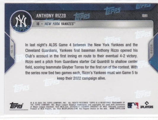 2022 TOPPS NOW #1091 ANTHONY RIZZO- NEW YORK YANKEES