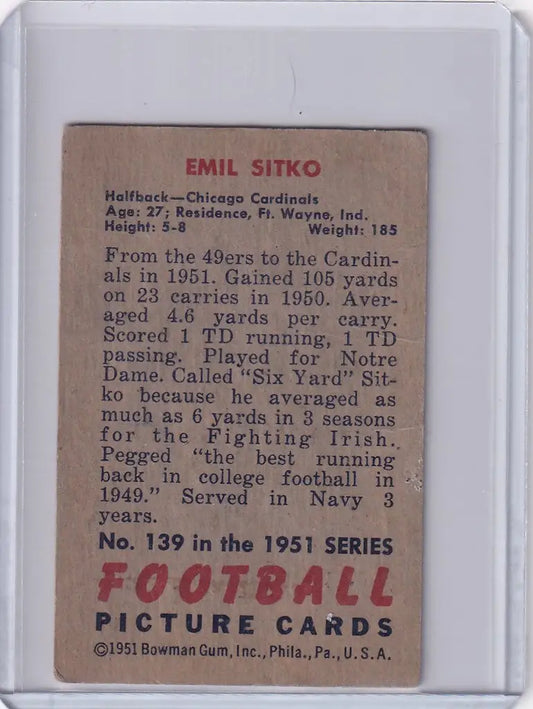 1951 Bowman Football #139 Emil Sitko - Chicago Cardinals