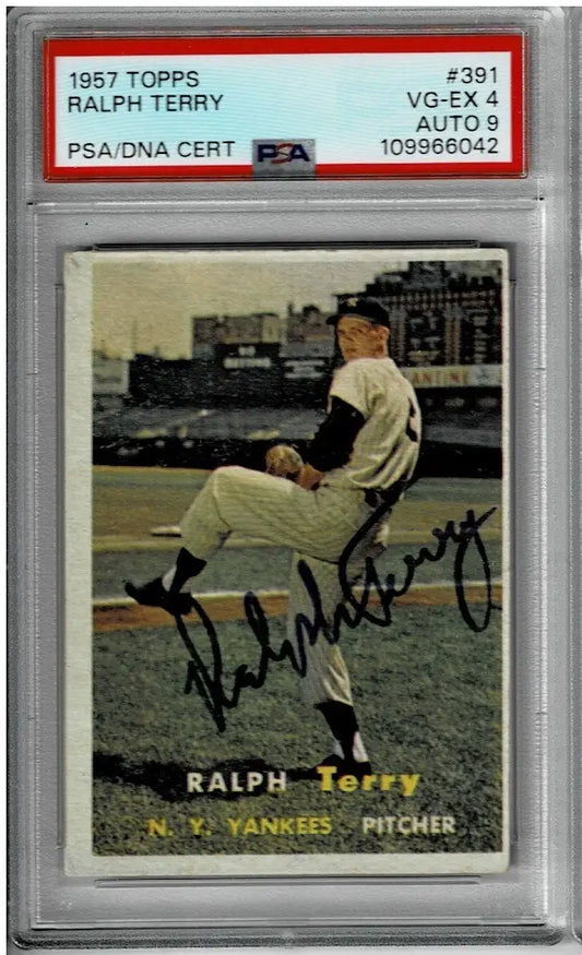 1957 Topps Baseball 391 Ralph Terry RC Autographed Signed NY Yankees PSA 4 DNA 9