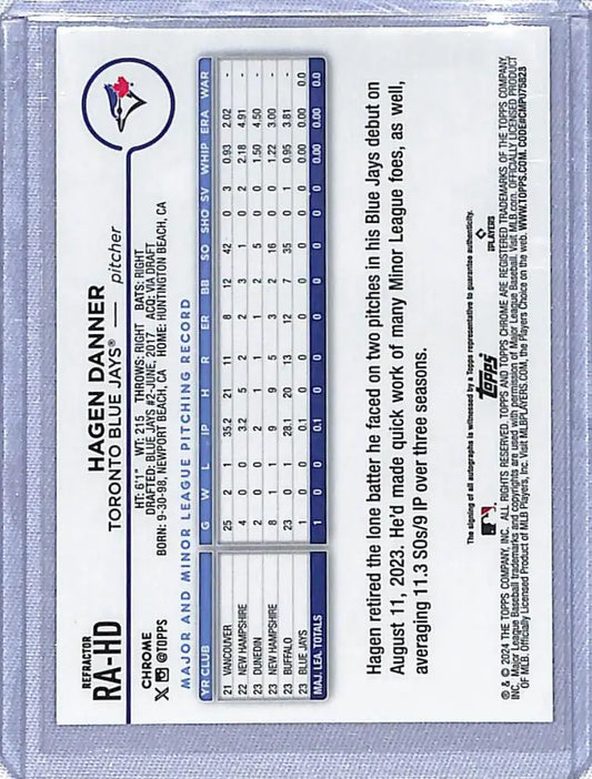 2024 Topps Chrome Rookie Autograph Refractor #RA-HD Hagen Danner NM-MT RC Rookie Auto 241/499 Toronto Blue Jays Baseball Card