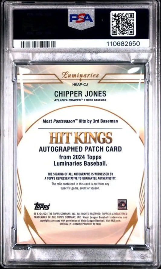 2024 Topps Luminaries Hit Kings Patches #HKAP-CJ Chipper Jones PSA 10 GEM MINT MEM Auto 8/15 Atlanta Braves Baseball Card