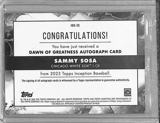 2023 Topps Inception Dawn of Greatness Orange #IDG-SS Sammy Sosa NM-MT Auto 6/10 Chicago White Sox Baseball Card