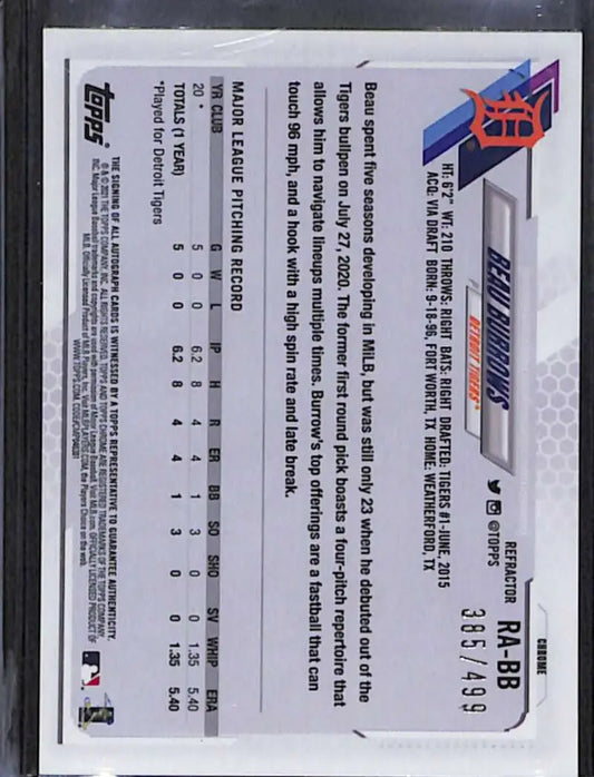 2021 Topps Chrome #RA-BB Beau Burrows Rookie Auto Refractor #/499 NM-MT Baseball Card