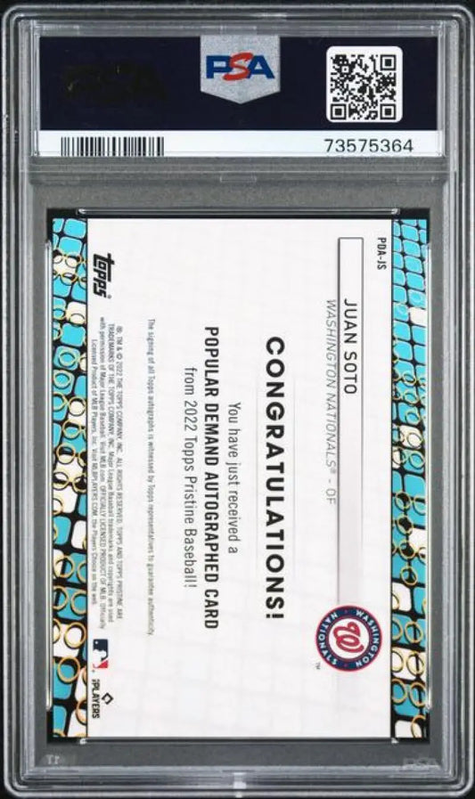 2022 Topps Pristine Popular Demand Refractor #PDA-JS Juan Soto PSA 10 GEM MINT Auto Washington Nationals Baseball Card