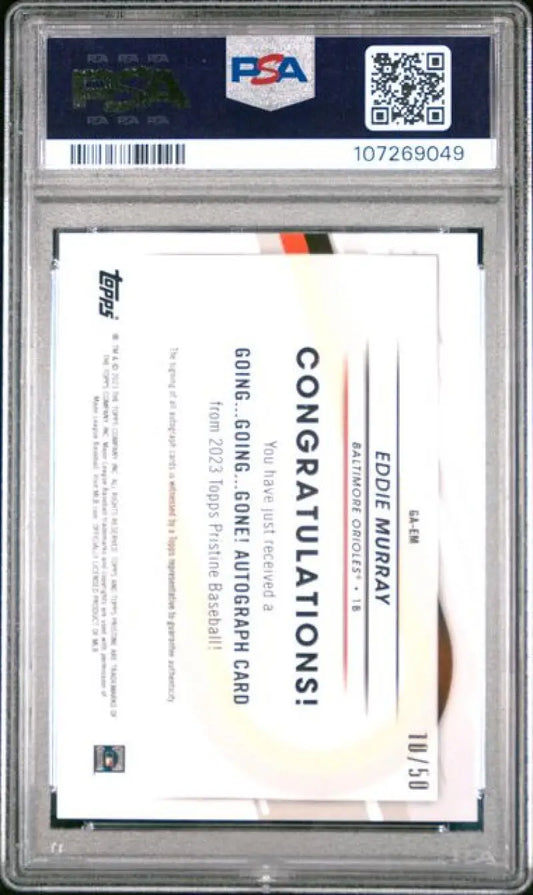 2023 Topps Pristine Going Going Gone Autograph Refractor Gold #GA-EM Eddie Murray PSA 10 GEM MINT Auto 10/50 Baltimore Orioles Baseball Card