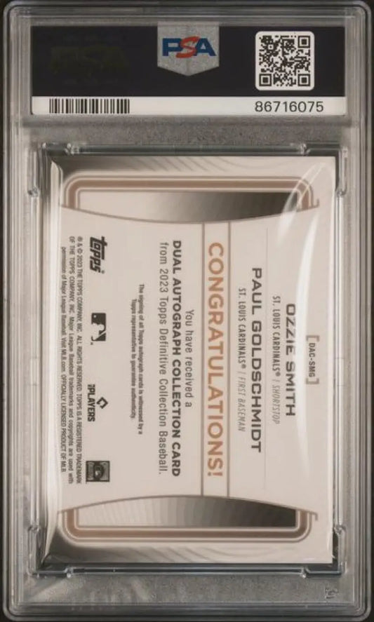 2023 Topps Definitive Collection Dual Autograph Purple #DAC-SMG Ozzie Smith/ Paul Goldschmidt PSA 10 GEM MINT Auto 5/5 St. Louis Cardinals Baseball Ca