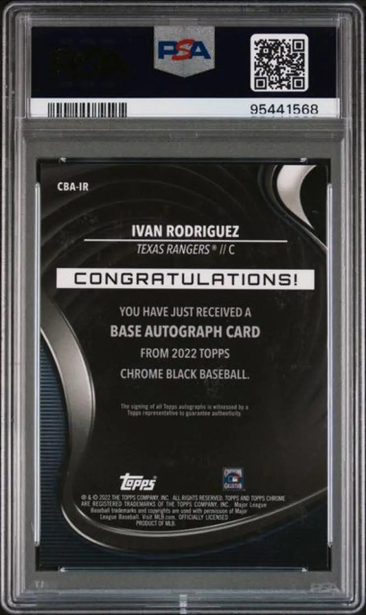 2022 Topps Chrome Black Refractor Orange #CBA-IR Ivan Rodriguez PSA 9 MINT Auto 24/25 Texas Rangers Baseball Card