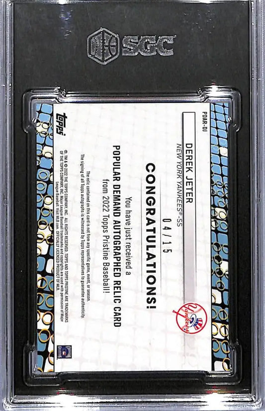 2022 Topps Pristine Popular Demand Autographed Relic Refractor Pink #PDAR-DJ Derek Jeter SGC 10 Gem MEM Auto 4/15 New York Yankees Baseball Card