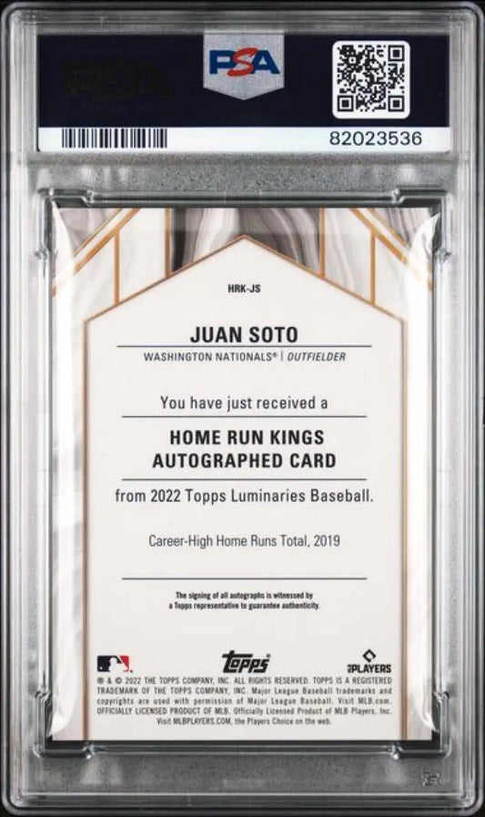 2022 Topps Luminaries #HRKJS Juan Soto PSA 9 MINT Auto 2/5 Washington Nationals Baseball Card