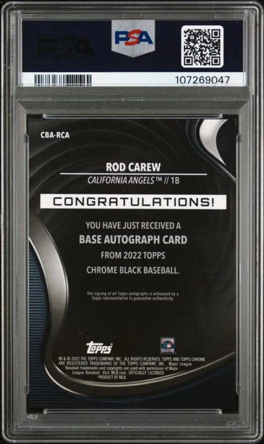 2022 Topps Chrome Black Autograph Refractor Gold Mini-Diamond #CBA-RCA Rod Carew PSA 8 NM-MT Auto 15/50 California Angels Baseball Card