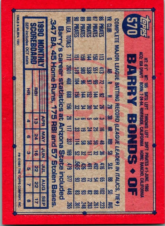 1991 Topps #570 Barry Bonds NM-MT Pittsburgh Pirates Baseball Card