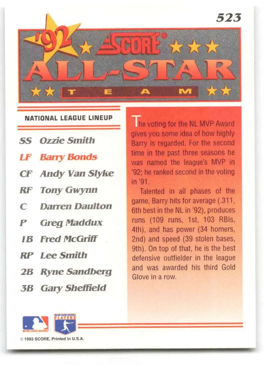 1993 Score #523 Barry Bonds AS NM-MT San Francisco Giants Baseball Card