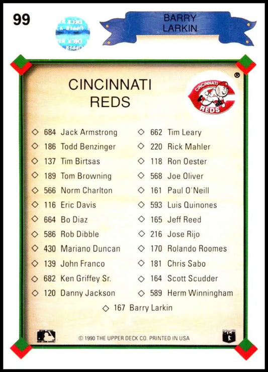 1990 Upper Deck #99 Barry Larkin TC NM-MT Cincinnati Reds Baseball Card