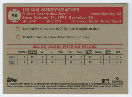 2021 Topps Chrome Platinum Anniversary #98 Julian Merryweather NM-MT RC Rookie Toronto Blue Jays Baseball Card