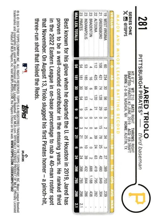 2024 Topps #281 Jared Triolo NM-MT RC Rookie Pittsburgh Pirates Baseball Card