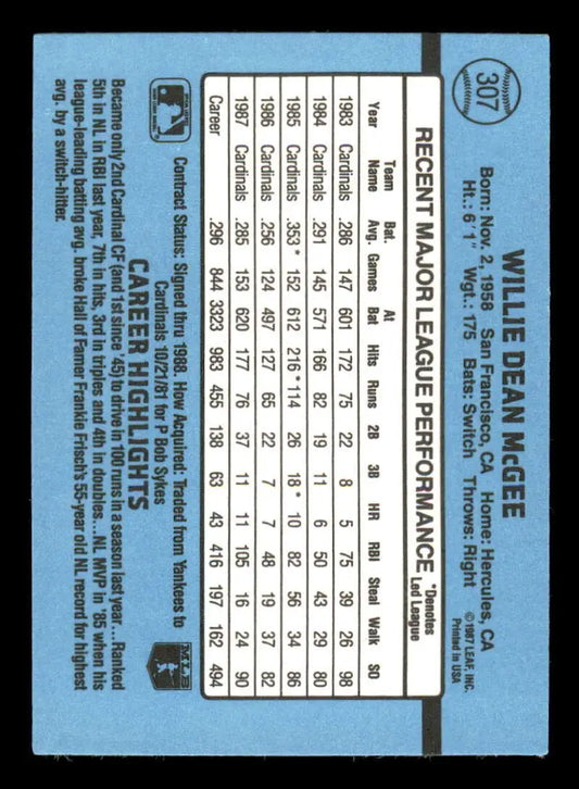1988 Donruss #307 Willie McGee EX St. Louis Cardinals Baseball Card