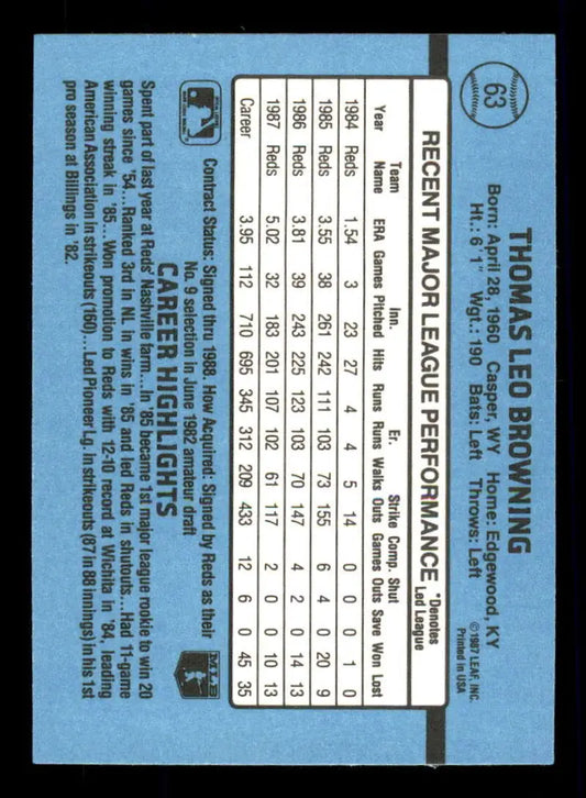 1988 Donruss #63 Tom Browning EX Cincinnati Reds Baseball Card