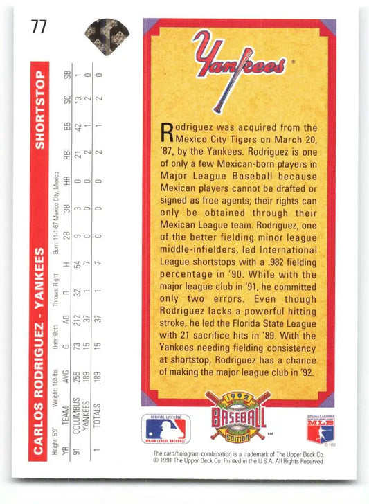 1992 Upper Deck #77 Carlos Rodriguez TP NM-MT New York Yankees Baseball Card