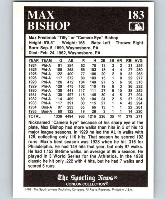 1991 Conlon Collection #183 Max Bishop EX Excellent Boston Red Sox Baseball Card