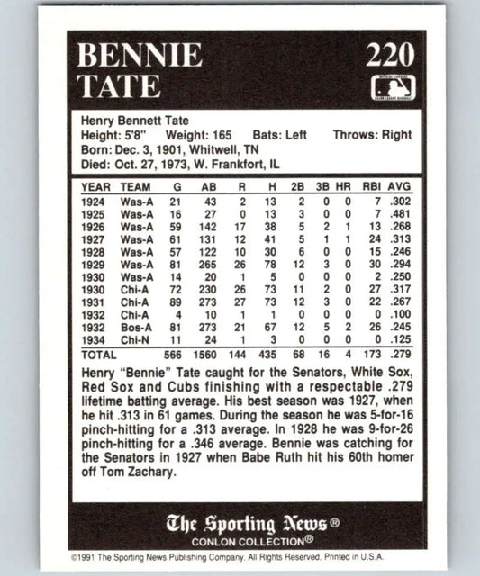 1991 Conlon Collection #220 Bennie Tate EX Excellent Washington Senators Baseball Card