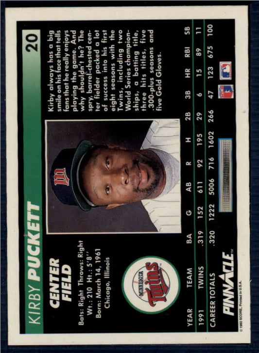 1992 Pinnacle #20 Kirby Puckett EX Minnesota Twins Baseball Card