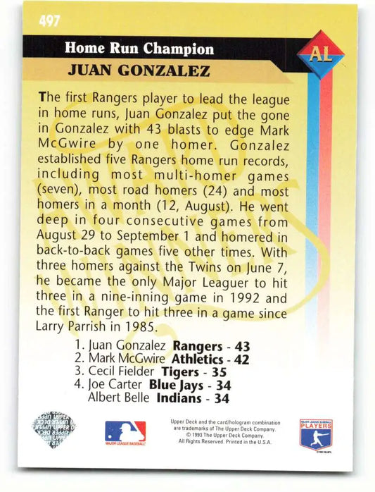 1993 Upper Deck #497 Juan Gonzalez AW VG Texas Rangers Baseball Card