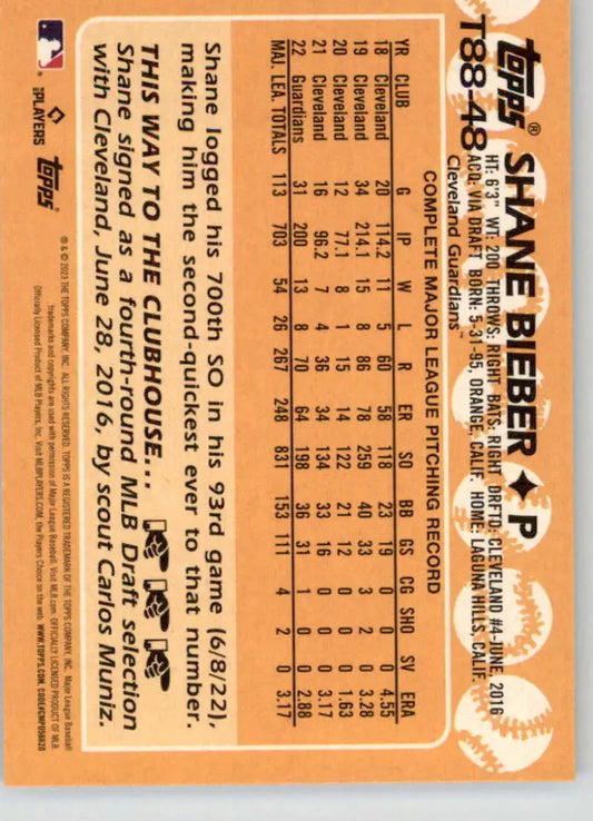 2023 Topps 1988 Baseball #T88-48 Shane Bieber NM-MT Cleveland Guardians Baseball Card