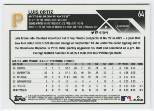 2023 Topps Chrome #64 Luis Ortiz NM-MT RC Rookie Pittsburgh Pirates Baseball Card