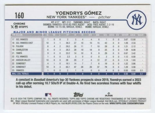 2024 Topps Chrome #160 Yoendrys Gomez NM-MT RC Rookie New York Yankees Baseball Card